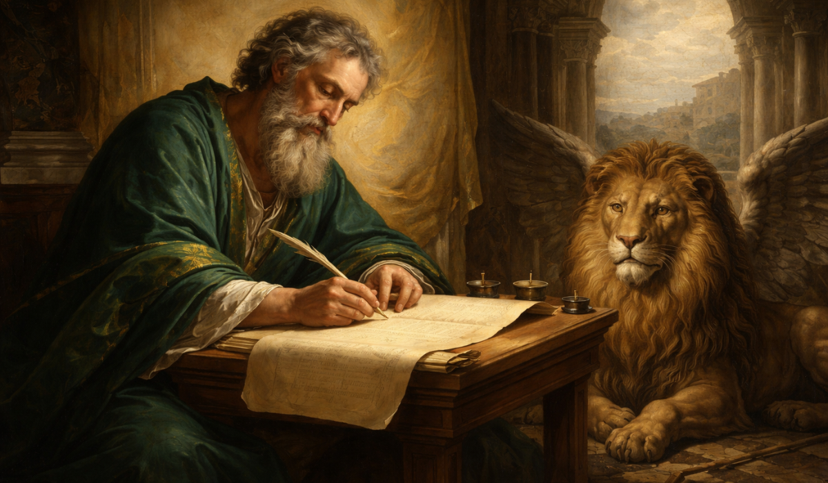 His symbol — the winged lion — reflects the bold and powerful proclamation of Christ.
